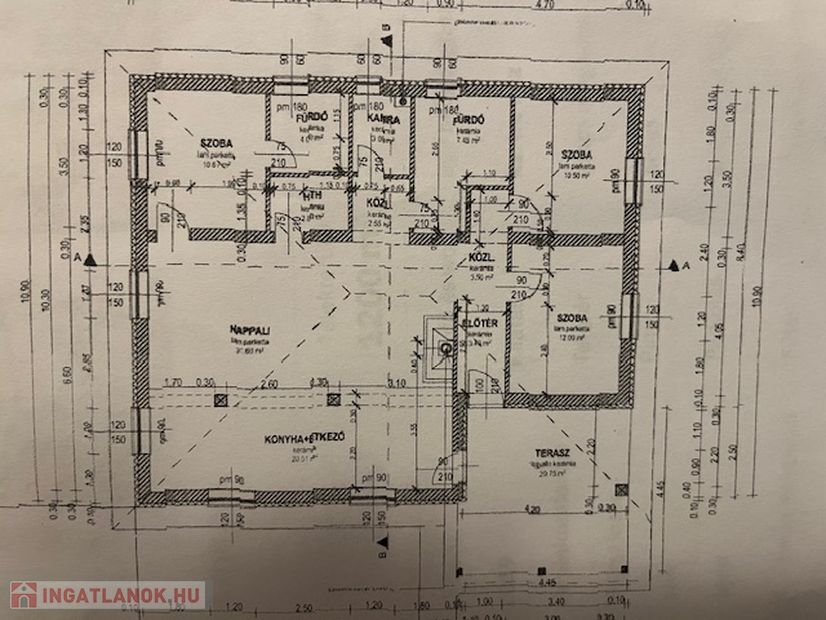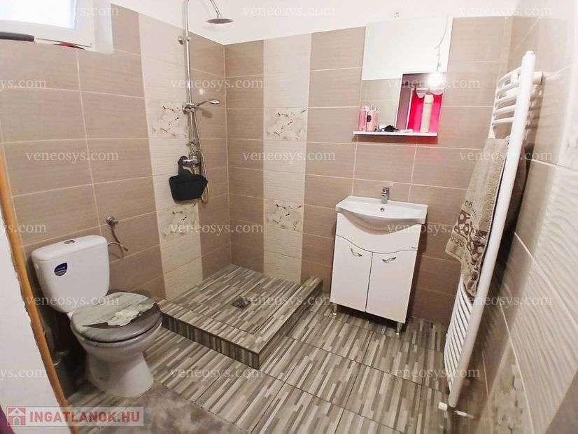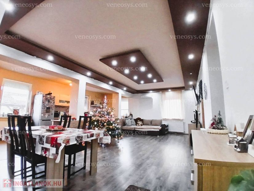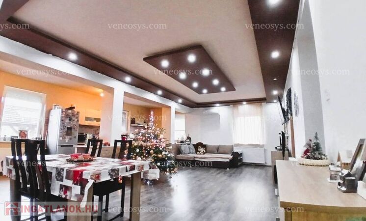 Ház elosztása: előtér, amerikai konyhás nappali, 3 külön bejáratú szoba, 2 fürdőszoba, kamra.